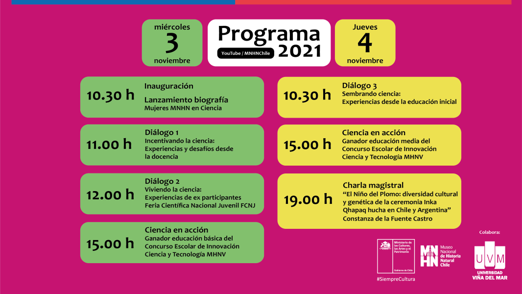 Se ha preparado una completa programación que será transmitida a través del canal de YouTube del MNHN. El lanzamiento será el miércoles 3 de noviembre a las 10:30 horas y posteriormente se estrenarán los diálogos de ciencia escolar con la participación de profesoras, profesores y estudiantes que han participado en distintas versiones de la Feria Nacional Científica Juvenil.