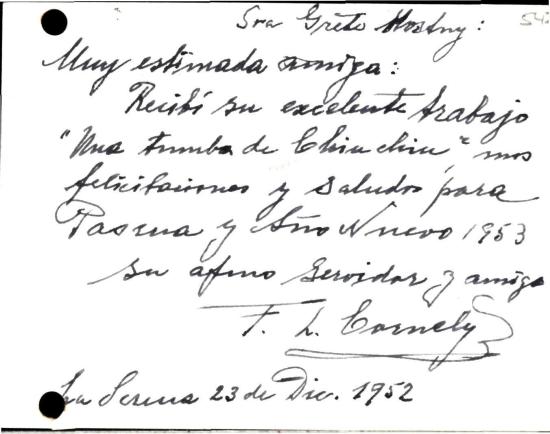 Grete Mostny fue una arqueóloga austriaca muy destacada en nuestro país, que también dirigió el MNHN entre 1964 a 1982. Fue famosa por sus trabajos en egiptología, arqueología del norte y centro de Chile, trabajos etnográficos, contribución a la museología en Chile, la creación de una feria científica juvenil y por el estudio y preservación del niño del Cerro El Plomo. Quienes la conocieron destacan no sólo su calidad profesional, sino que también su gran calidad humana. En tales memorias se destaca siempre que tenía un tono de voz muy especial y un acento particular derivado de su lengua materna. Sin embargo, más allá de sus fotografías, hasta el día de hoy no teníamos un registro conocido de su voz en extenso.